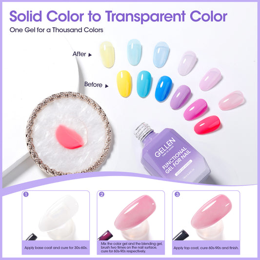 Gellen Multifunctional Blending Gel, 18ML 7-in-1 Nail Gel for Mix Powder Glitter Jelly Colors Nails, UV Blooming Gel for Spread Effect, Nail Glue for Nail Tips, Strengthener Nail Brush for Apex Build